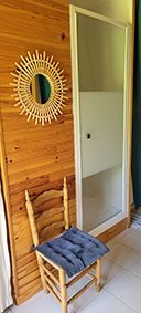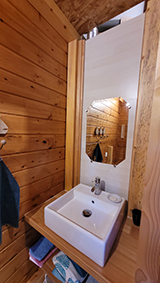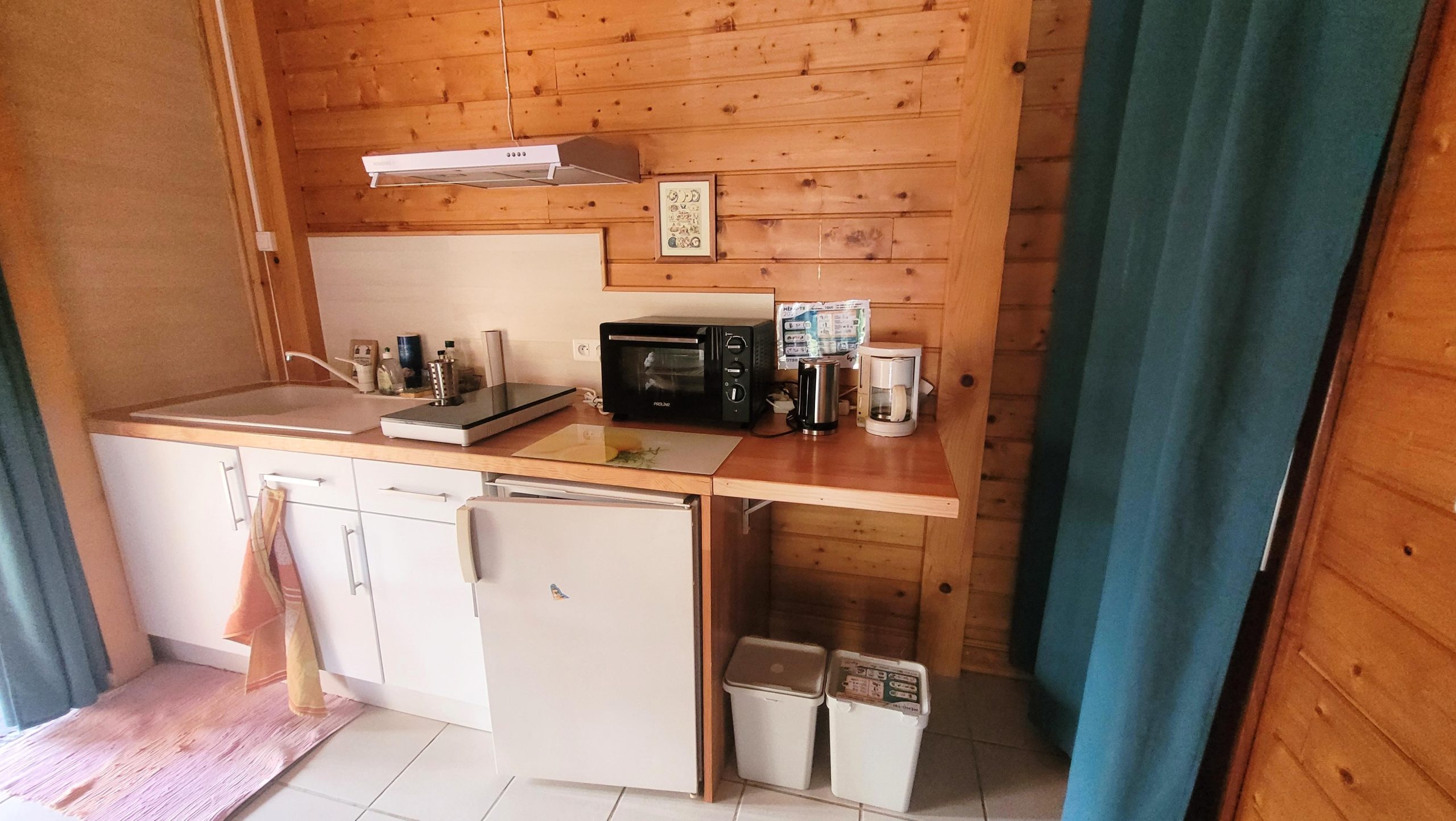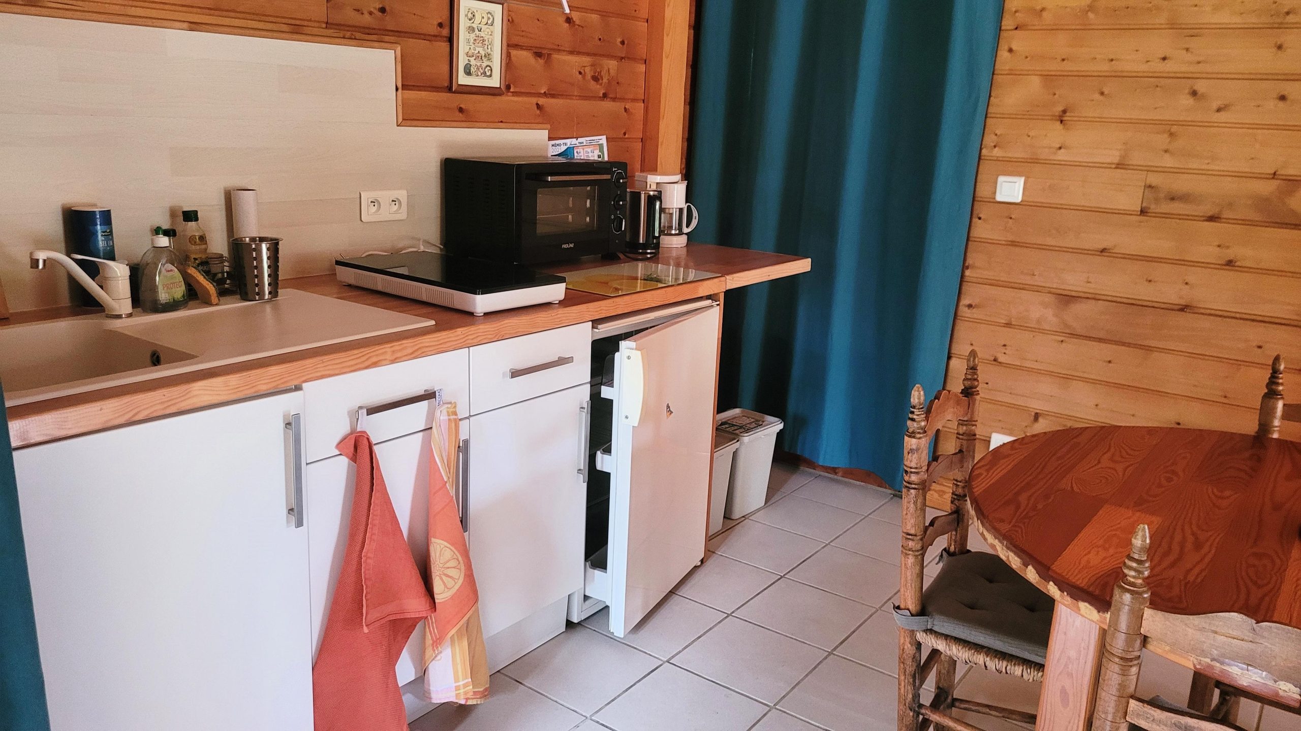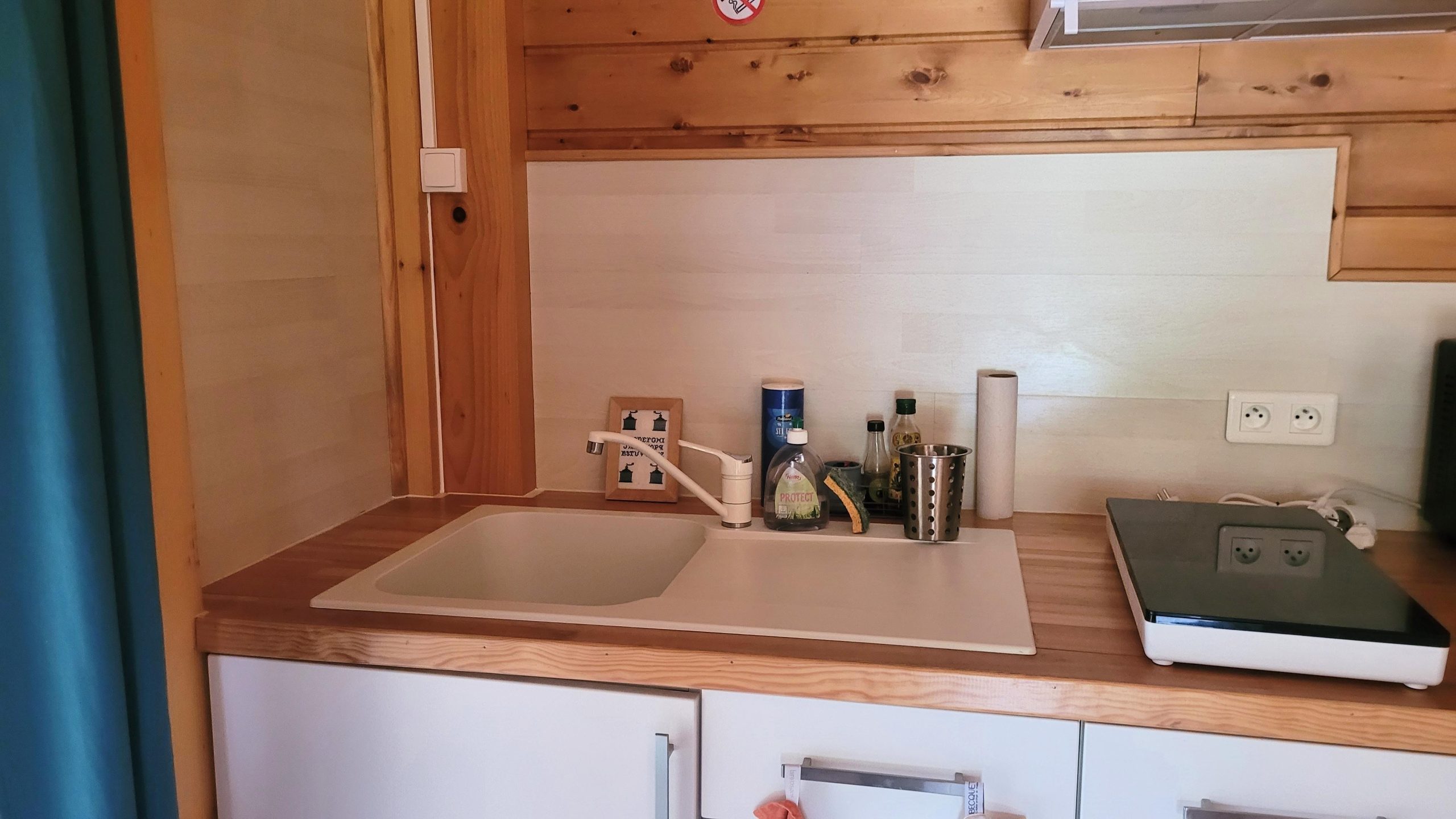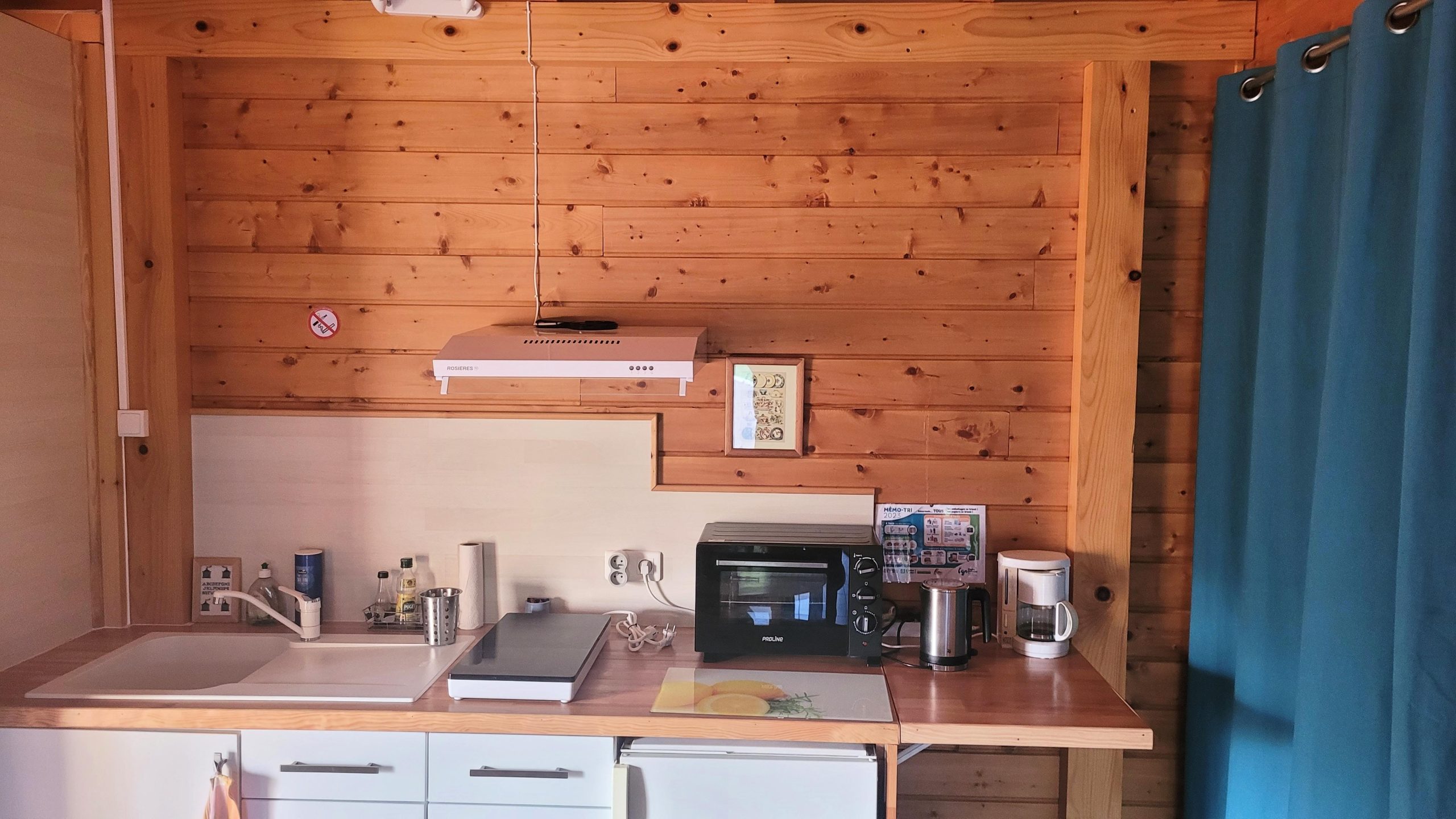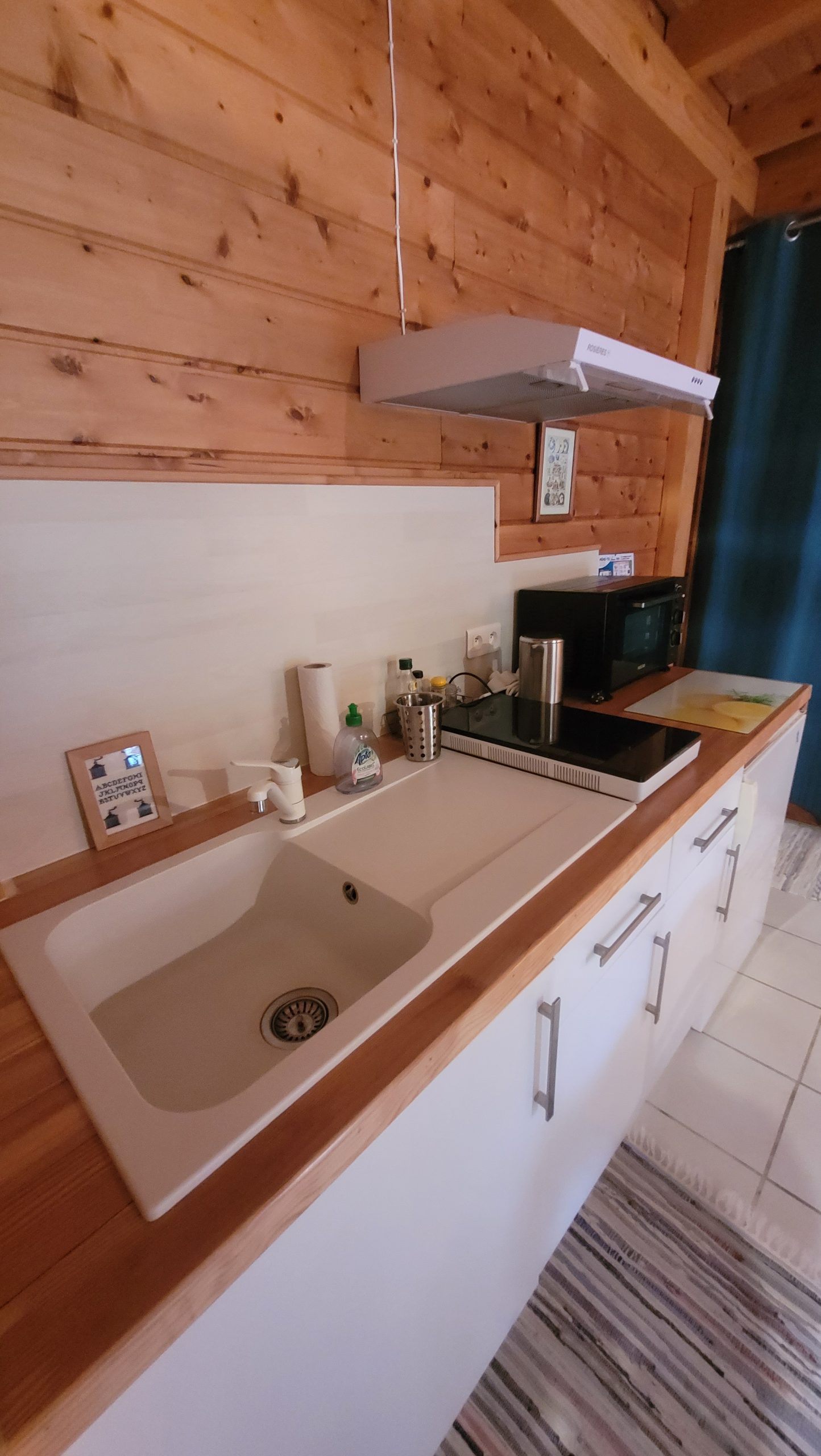 L’aménagement est confortable et insolite, ajoutant une touche unique à votre séjour. Le logement, au calme, est dans un style entièrement en bois intérieur comme extérieur.
