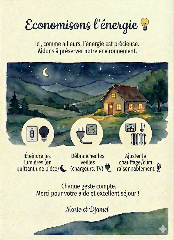 - 💡 Lumières : Pensez à éteindre en quittant une pièce. Le ciel étoilé du Comminges est encore plus beau dans le noir 🙂